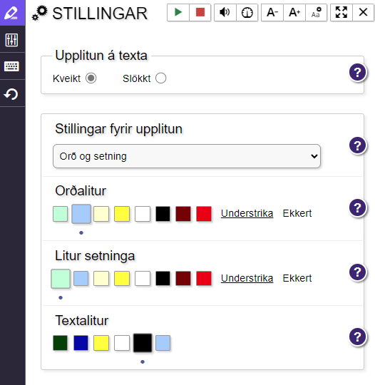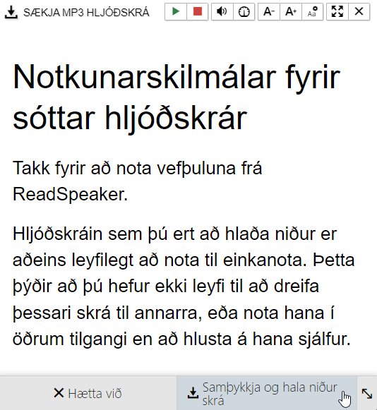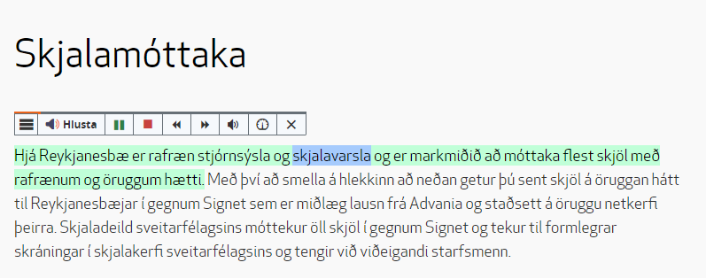 Til að hefja lesturinn er smellt á hlusta hnappinn. Skjálesarinn byrjar þá að lesa textann á vefsíðunni upphátt og einnig birtast fleiri stillingarmöguleikar.