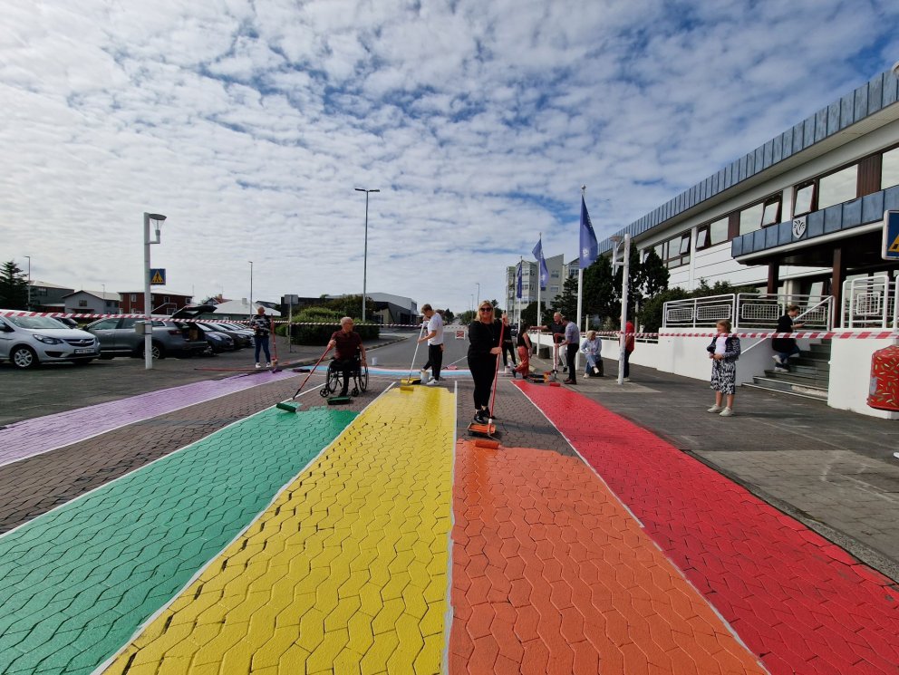 Gangbraut fjölbreytileikans, sjálf regnbogabrautin, fékk andlitslyftingu í góða veðrinu í dag. Regnbogabrautin sem liggur fyrir framan ráðhús Reykjanesbæjar er máluð út frá fána fjölbreytileikans sem er nýttur í mannréttindabaráttum víðsvegar um heim.