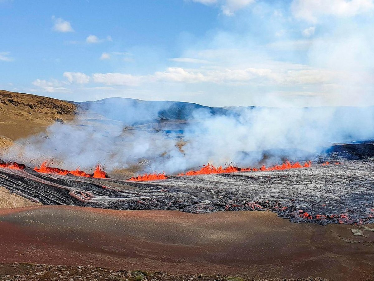 Vísindafólk og fulltrúi frá Almannavörnum fóru í könnunarflug yfir gosstöðvarnar til að meta umfang eldgossins. Það er mat þeirra að eldgosið sé fremur lítið og ógni ekki byggð eða mannvirkjum.