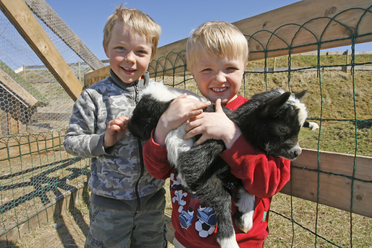 Í landnámsdýragarðinum eru kálfar, lömb og kiðlingar, einnig hænsni og kanínur í skemmtilegu umhverfi.