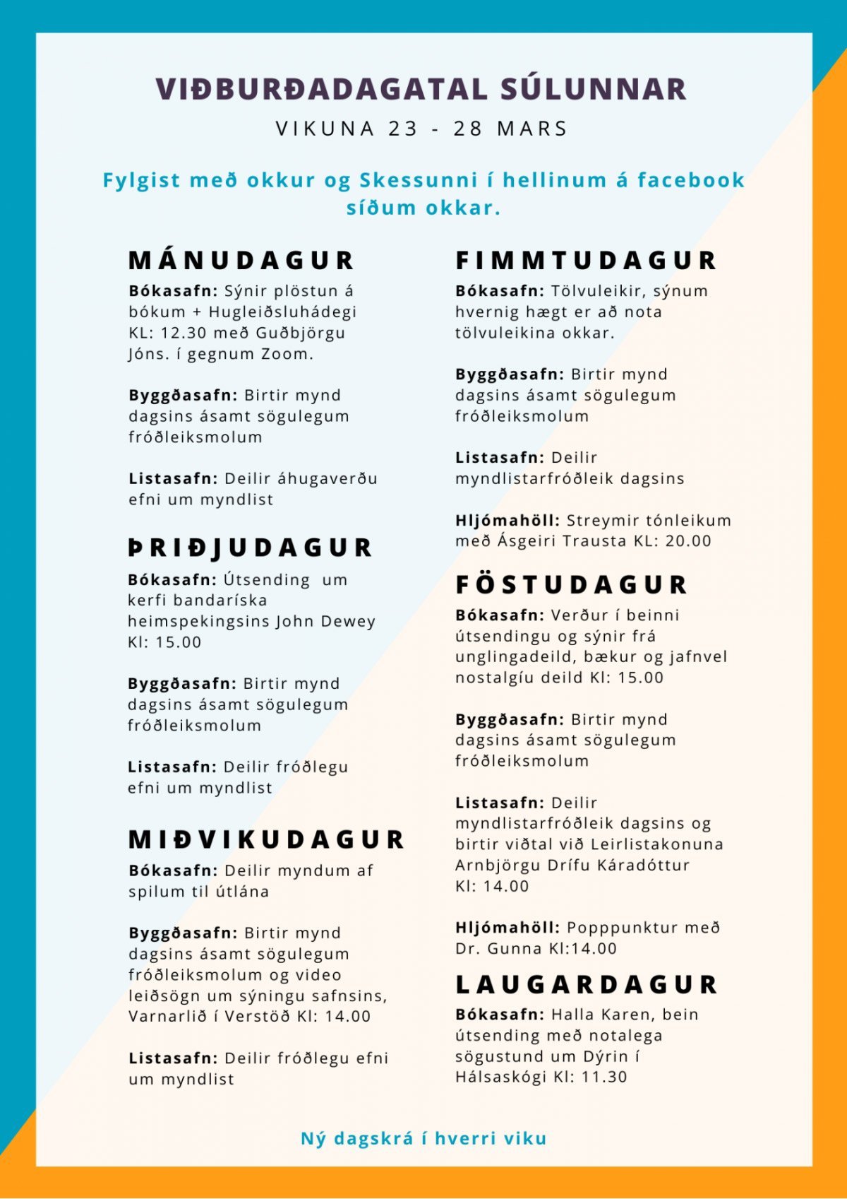 Vikulega birtist auglýsing þar sem megin dagskrá allra stofnana verður að finna á einum stað svo fólk geti betur áttað sig á hvað er í boði, hvar og hvenær en óhætt er að segja að þar kenni ýmissa grasa. Auglýsinguna verður að finna á facebooksíðum stofnananna, auk facebooksíðu Reykjanesbæjar og í viðburðadagatali á vefsíðu Reykjanesbæjar, reykjanesbaer.is.