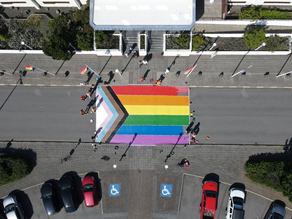 Gangbraut fjölbreytileikans, sem liggur fyrir framan ráðhús Reykjanesbæjar, var máluð í dag í litum fána hinseginleikans, sem hefur verið nýttur við mannréttindabaráttu víðs vegar um heiminn. Gangbrautin var máluð í tilefni af Hinsegin dögum sem standa yfir þessa dagana.