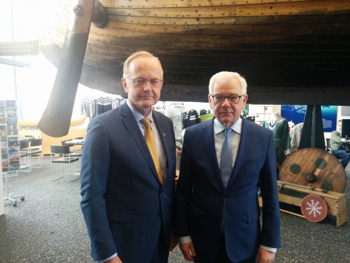 Utanríkisráðherra Póllands var í opinberri heimsókn á Íslandi á föstudag og laugardag. Hann kom við í Víkingaheimum á leið heim á laugardag enda mjög áhugasamur um sögu Víkinga. Ásamt því að hitta bæjarstjóra Reykjanesbæjar fékk Jacek skoðunarferð um Víkingaheima í fylgd pólskumælandi starfsmanns safnsins.