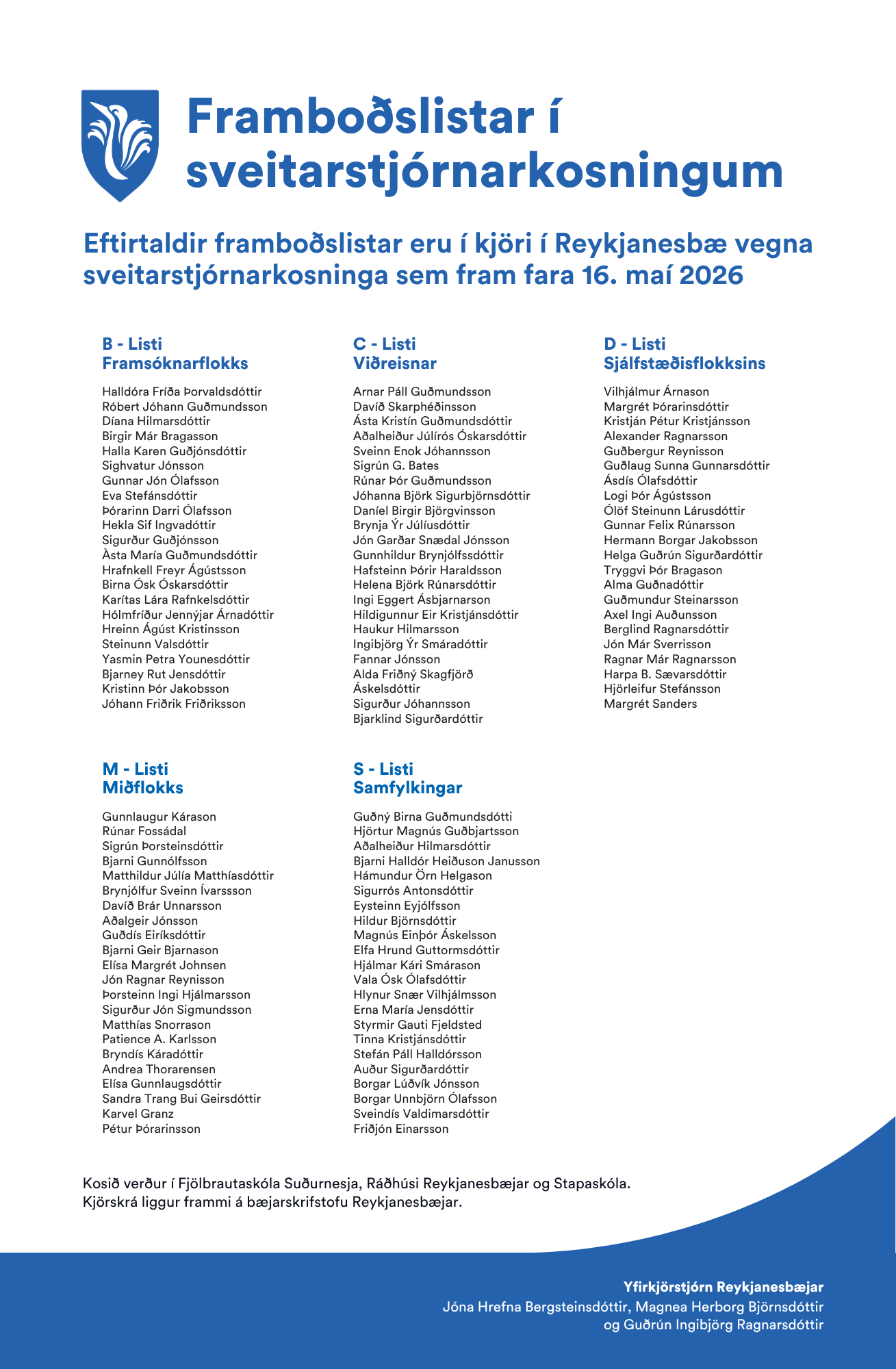 Yfirkjörstjórn Reykjanesbæjar hefur farið yfir framlagða framboðslista vegna komandi sveitarstjórnarkosninga í samræmi við ákvæði laga um kosningar til sveitarstjórna nr. 112/2021.