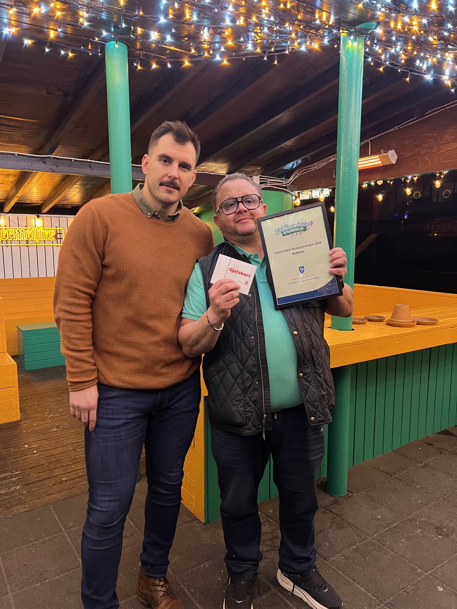 Það var Trausti Arngrímsson, formaður menningar- og þjónusturáðs Reykjanesbæjar, sem heimsótti eigendur jólahússins og jólafyrirtækisins og afhenti þeim viðurkenningu frá Reykjanesbæ og Húsasmiðjunni.