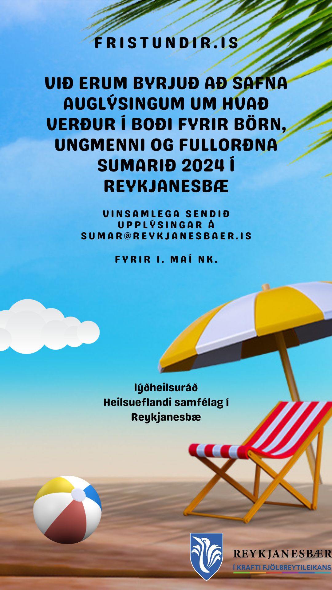 Ef félagar eða klúbbar áforma að bjóða börnum, ungmennum og/eða öðrum íbúum í Reykjanesbæ upp á tómstunda- og/eða leikjanámskeið eða aðra afþreyingu í sumar biðjum við um að upplýsingar verði sendar til íþrótta- og tómstundafulltrúa á netfangið: sumar@reykjanesbaer.is fyrir 1. maí nk. Endilega sendið myndir með.