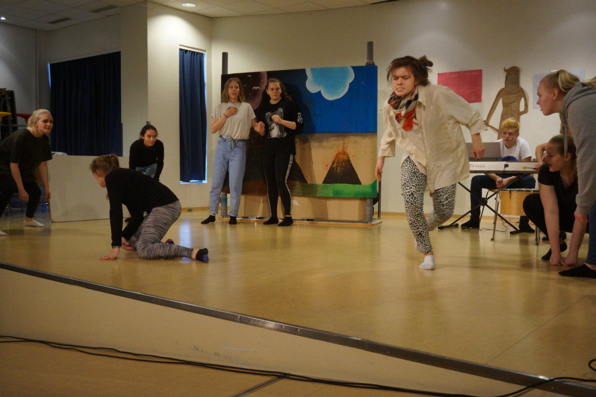 Í Akurskóla var unnið með myndlist, leiklist og tónlist og afraksturinn sýndur á sal skólans í dag fyrir nemendur í 3. bekk. Um var að ræða stutt leikverk þar sem blandað var saman vinnu þeirra sem unnu í myndlistinni, sviðsmynd/bakgrunn, sem hreyfðist í tak við tímabelti sem leikendur fóru á. Undir var svo spiluð tónlist eftir nemendur.